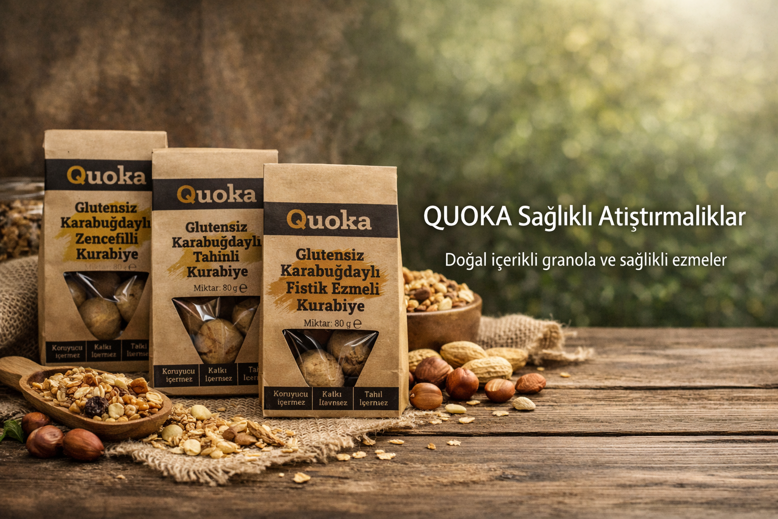 Quoka sağlıklı atıştırmalıklar; rafine şeker içermeyen, tamamen doğal içeriklerle hazırlanmış besleyici ve lezzetli ürünlerden oluşur. Ürünlerimizde karabuğday unu kullanılır ve tatlandırma işlemi doğal hurma ile yapılır.